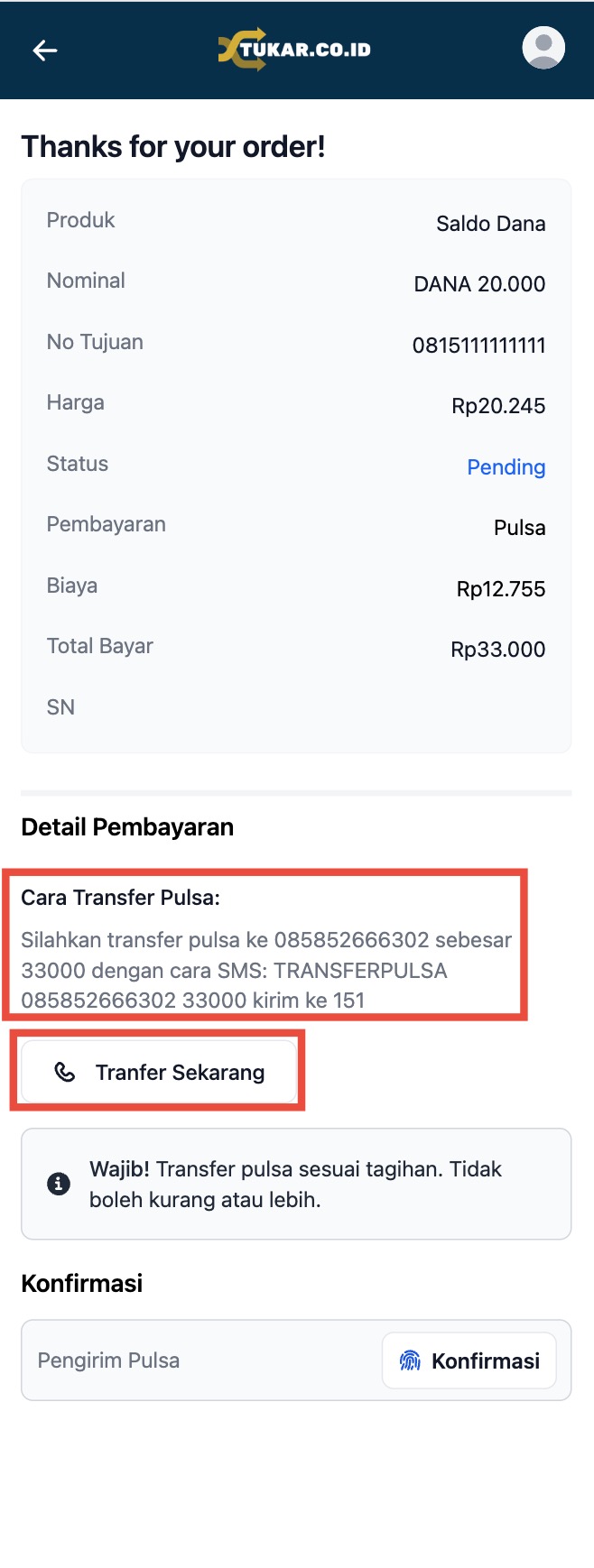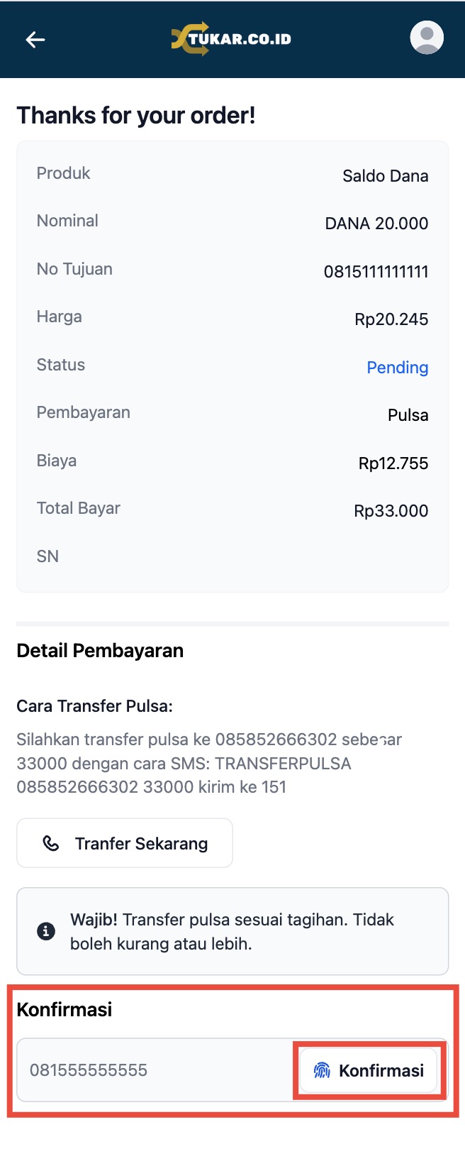 Masukan nomer pengirim pulsa lalu klik tombol KONFIRMASI