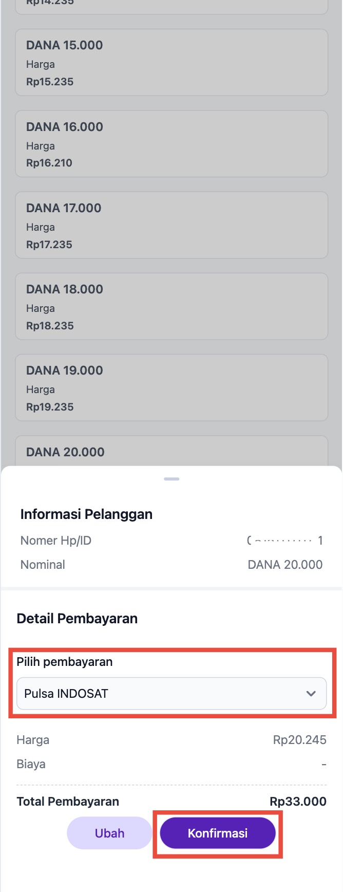 Silahkan klik nominal yang tersedia dan akan muncul detail produk nominal hingga pemilihan metode pembayaran