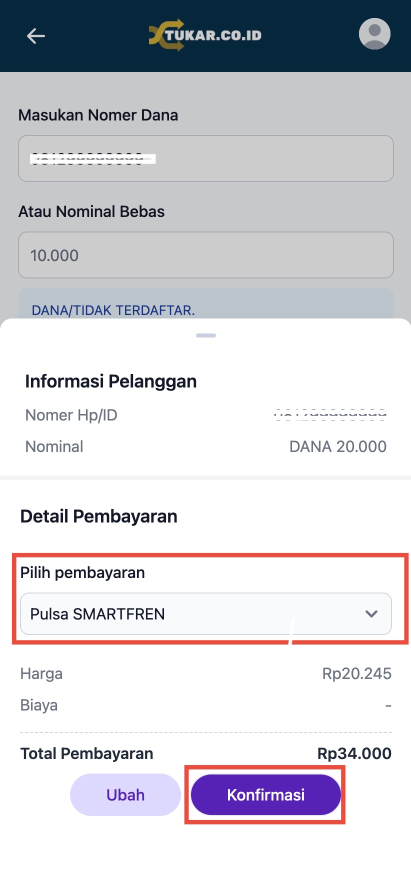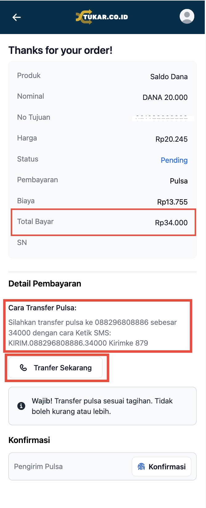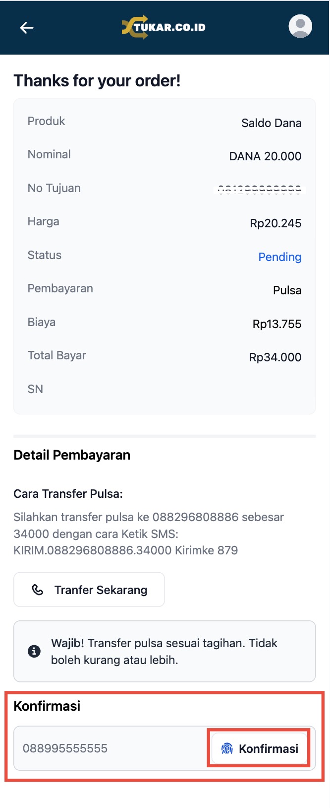 Masukan nomer pengirim pulsa lalu klik tombol KONFIRMASI