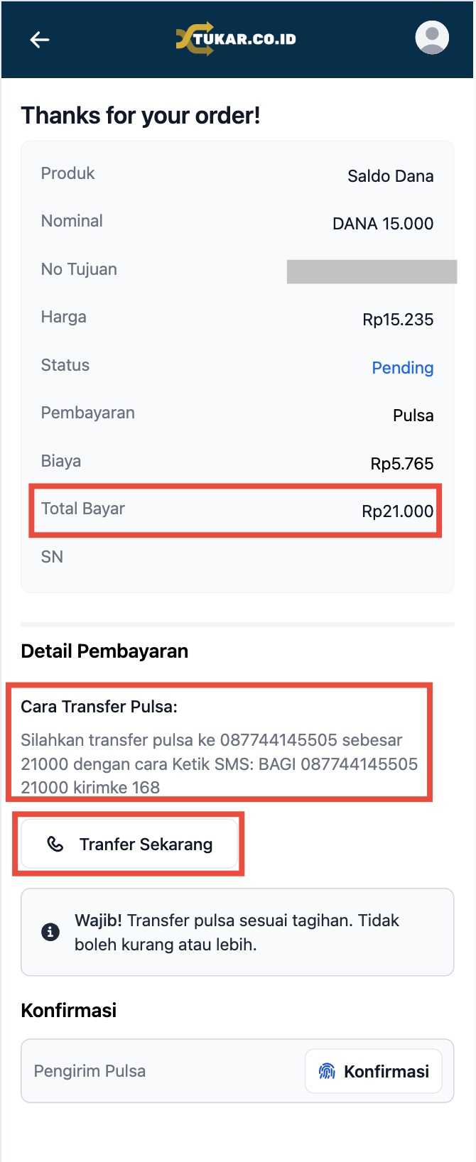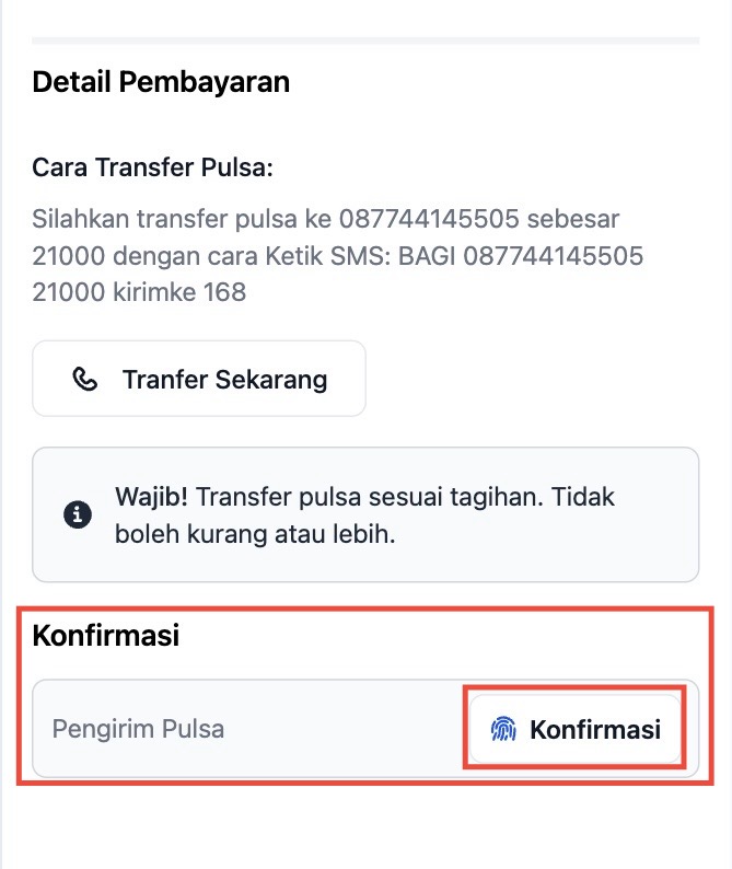 Masukan nomer pengirim pulsa lalu klik tombol KONFIRMASI